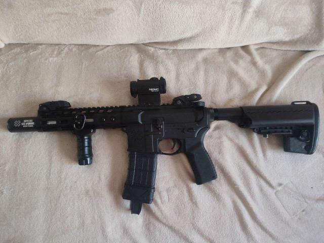 В комплекті привід, рукоятка, приціл redwin(купувався за 5К, по завіренню продавця підходить і на вогнепал), змінені механічні прицільні, також ліхтар 2П"Кліщ", 2 QD антабки та 5 магазинів як на фото. Є рідна коробка.