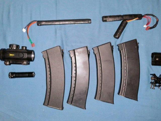 В компетенцию входит: страйкбольный автомат, 4 магазина, 2 аккумулятора, прицел и так по мелочи что на фото